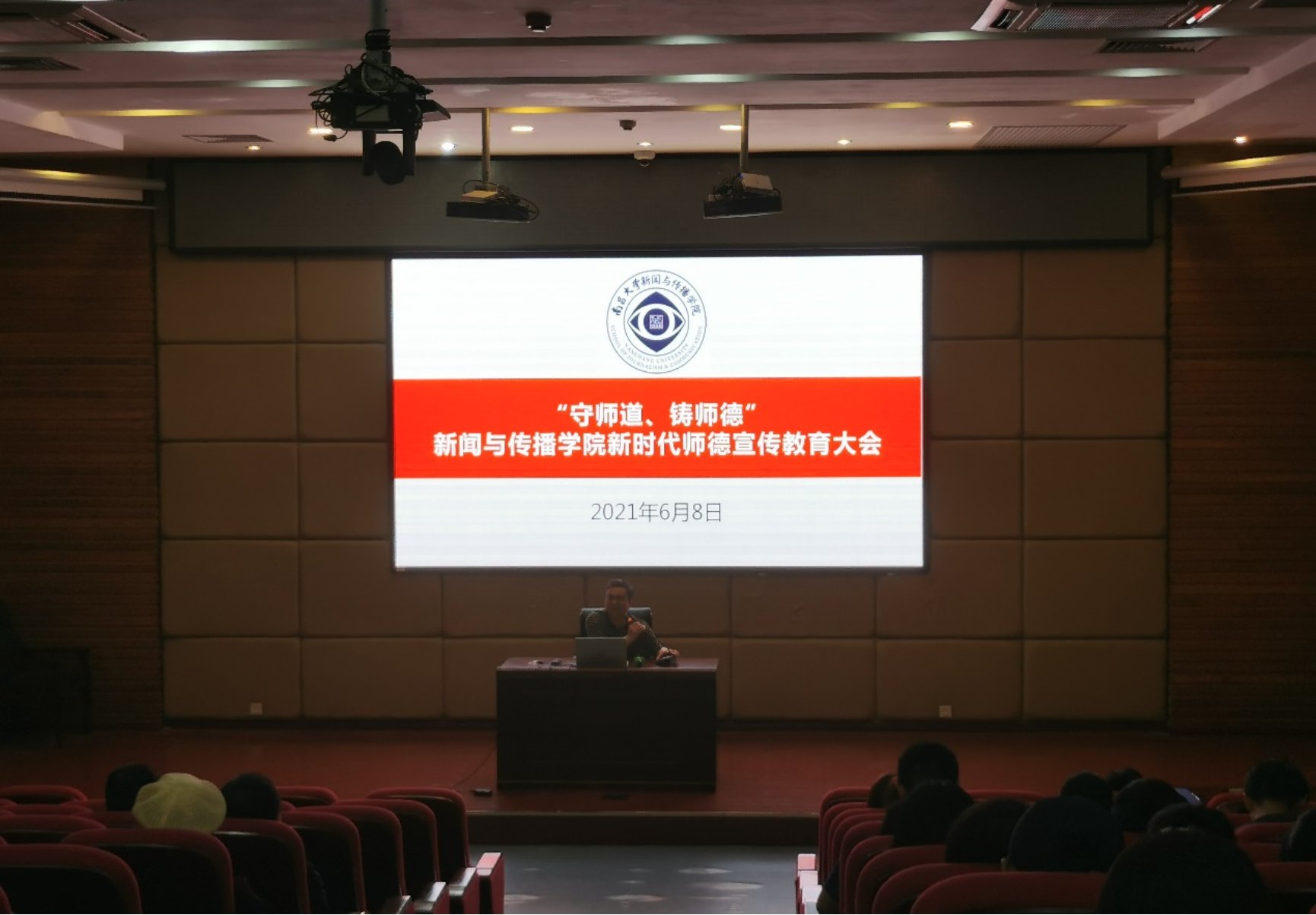 2021年6月8日,新传学院在人文楼A143开展“守师德、铸师德”新时代师德宣传教育大会。会议由陈信凌院长主持,新传全体教师参与此次教育大会。陈信凌院长在会议中强调,教师要坚守师德底线,明确作为一名新时代教师的目标与责任担当。