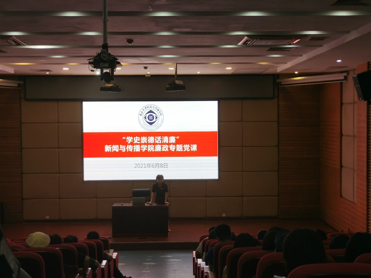 (二) 学党史讲党课 2021年6月8日,新传学院在人文楼A143开展“学史崇德话清廉”廉政专题党课。此次廉政专题党课由新传学院党委书记程志红主持,程书记从学史明理知敬畏、学史增信存戒惧、学史崇德守底线、学史力行作表率四个方面进行内容分享 。程书记强调,通过党史的学习,我们要弘扬精神谱系中的优秀成果,发挥新传学院的专业特色,用创新、生动的方式传播我们党的历史 。