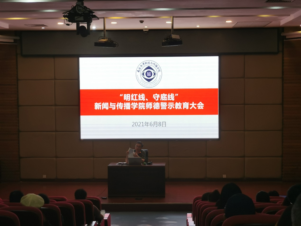 2021年6月8日,新传学院在人文楼A143开展“明红线、守底线”师德警示教育大会。会议由陈信凌院长主持,新传全体教师参与此次师德警示教育大会。陈信凌院长强调,教师要守住纪律底线,不碰法律红线,时时处处严格要求自己。