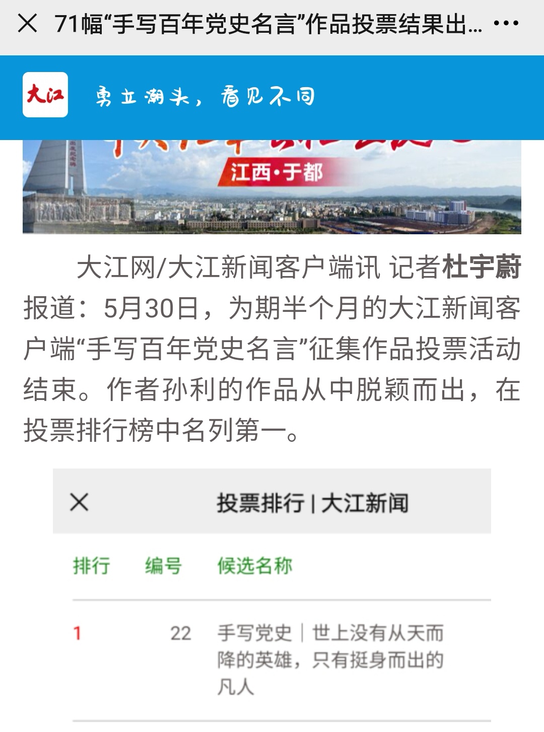 新传学院孙利老师在大江新闻客户端举办的“手写百年党史名言”征集作品投票活动中名列第一。
