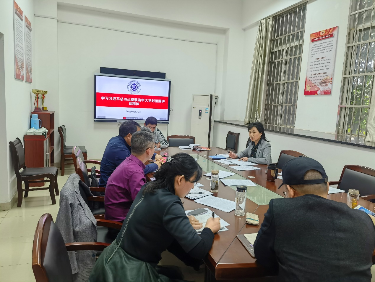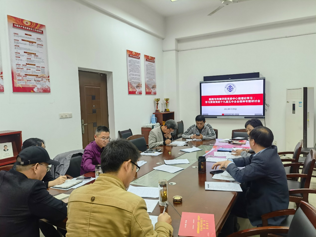 (二) 学党史讲党课 1.新传学院党委召开学习贯彻党的十九届五中全会精神专题研讨会 4月26日下午,新传学院党委召开了学习贯彻党的十九届五中全会精神专题研讨会,会上,学院党委中心组集中学习了习近平总书记视察清华大学时重要讲话精神。新传学院党委班子成员均做了个人学习体会发言。党委书记程志红同志强调,要认真学好、领悟好习近平总书记的讲话内容及对人文社会学科教育发展道路的寄语。她提到:“习近平同志指出,要坚持中国特色社会主义教育发展道路,充分发挥科研优势,增强学科设置的针对性,加强基础研究,加大自主创新力度,并从我国改革发展实践中提出新观点、构建新理论,努力构建中国特色、中国风格、中国气派的学科体系、学术体系、话语体系。”