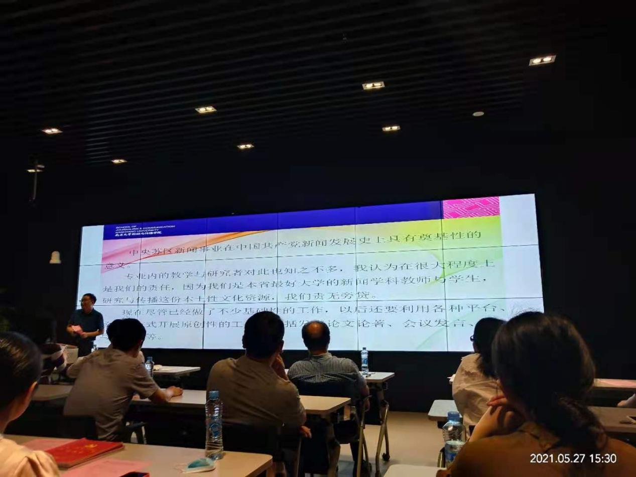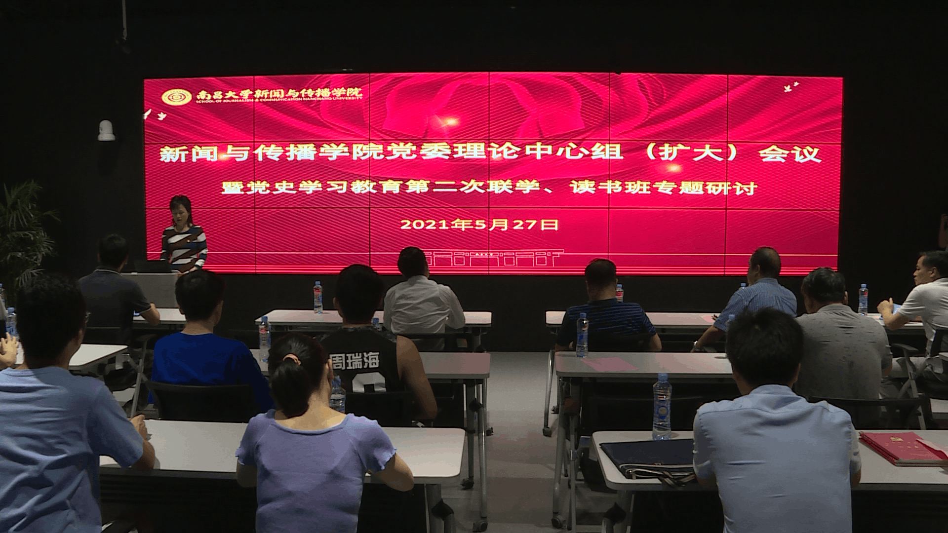 (二) 学党史讲党课 1.新传学院开展理论中心组(扩大)会议暨党史学习教育第二次联学、读书班,学院教师做领学交流 5月27日下午,我院党委理论中心组(扩大)会议暨党史学习教育第二次联学、读书班专题研讨会于优米app上线红色文化馆召开。陈信凌院长在《讲好红色新闻,传承红色基因》的交流分享中提出,在传承党的这份珍贵的精神遗产方面,新闻传播学的师生义不容辞,在当下党史学习教育的背景下,更应该把这段新闻历史讲清楚,发挥自身专业学科的特色,将党史学习教育和新闻传播专业结合起来,聚焦具体领域,加深学习效果。 胡一伟和王倩两位老师分享了本系的党史学习教育实践。胡一伟介绍了影视传播系师生深入革命老区的系列艺术实践,其中,建设南昌路段铁路“战斗英雄”叶道清的老兵精神,格外发人深省。而王倩老师则以《青春向党,奋斗有我;不负韶华,不忘初心》为题,结合电视剧《觉醒年代》里中国共产党建党的历程,剖析党的初心和传承百年的使命,强调当代党员应当以优秀榜样为奋斗坐标,燃起红色文化的燎原之火,不负韶华,追寻和传扬中国共产党的精神谱系。