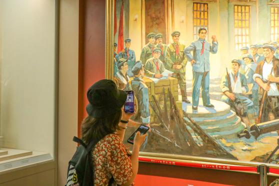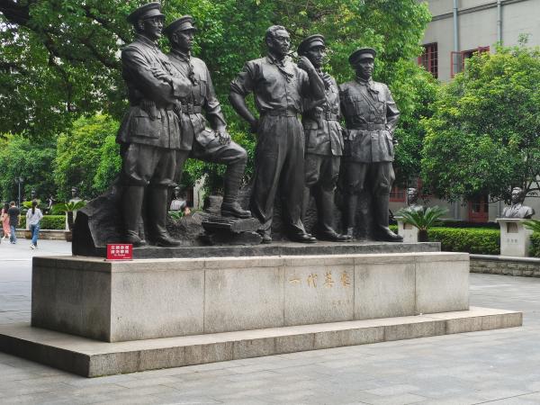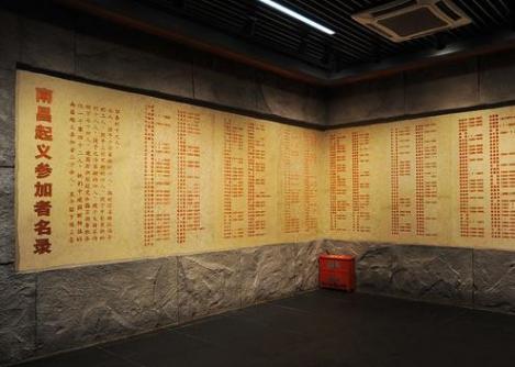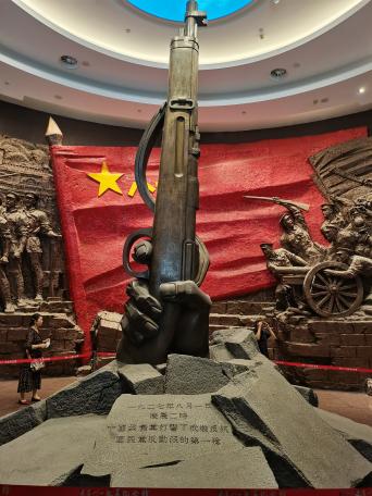 (两处场馆参观的同学在直播间内积极互动) 南昌八一起义纪念馆是为纪念南昌起义而设立的专题纪念馆,成立于1956年,整个纪念馆共两层,占地面积5903平方米,馆内陈列内容包括新馆大楼南昌起义、人民军队光辉历程以及旧址复原陈列,馆内陈列着多组图片、图表、文物展品、艺术品。 图1:南昌八一起义纪念馆大门 踏入纪念馆大门,映入眼帘的是由陈允贤于一九九七年创作的一组人物雕像《一代英豪》,刻画着南昌起义五位领导人:周恩来、贺龙、叶挺、朱德、刘伯承的勇敢与自信。进入大楼,只见一只巨手举着一把枪,这象征着打响南昌起义的第一枪。 图2:雕像《一代英豪》 图3:第一枪 同学们沿着馆内的指示方向依次参观,看见了威力巨大的大炮、火力十足的机关枪,也看见了牺牲在炮火中的革命烈士的名单、看见了为起义作出贡献的英雄的塑像,这些都让我们深刻了解到南昌起义的那段历史。 图4:大炮 图5:南昌起义参加者名单 继续往前走,就是一楼通往二楼的阶梯,它不似传统意义上的阶梯,阶梯是石头的,旁边长满了花草,四周的墙壁上画着井冈山的风景,每走一步都感觉置身于美丽的井冈山上。到了二楼,我们会看见大屏投影,字幕、动画、同期声的叠加,全方位向我们展示了南昌起义的全过程,同学们纷纷表示“心灵受到了震撼”。不管是在馆内还是在馆外,纪念品随处可见,军服展示以及军服的试穿都让我们对南昌起义有了更深刻的认识,同学们也纷纷表示“很有纪念意义,钱花得值”。