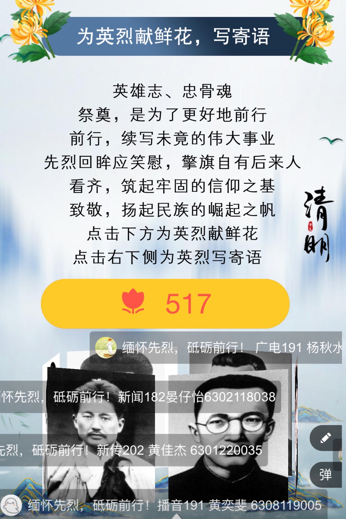 (三) 学党史办实事 之:清明线上缅怀英烈,重温党史砥砺前行 时值清明之际,院学生会组织开展了以“清明线上缅怀英烈,重温党史砥砺前行”为主题的线上云祭扫纪念英烈活动,号召同学们线上为英烈献鲜花,写寄语。