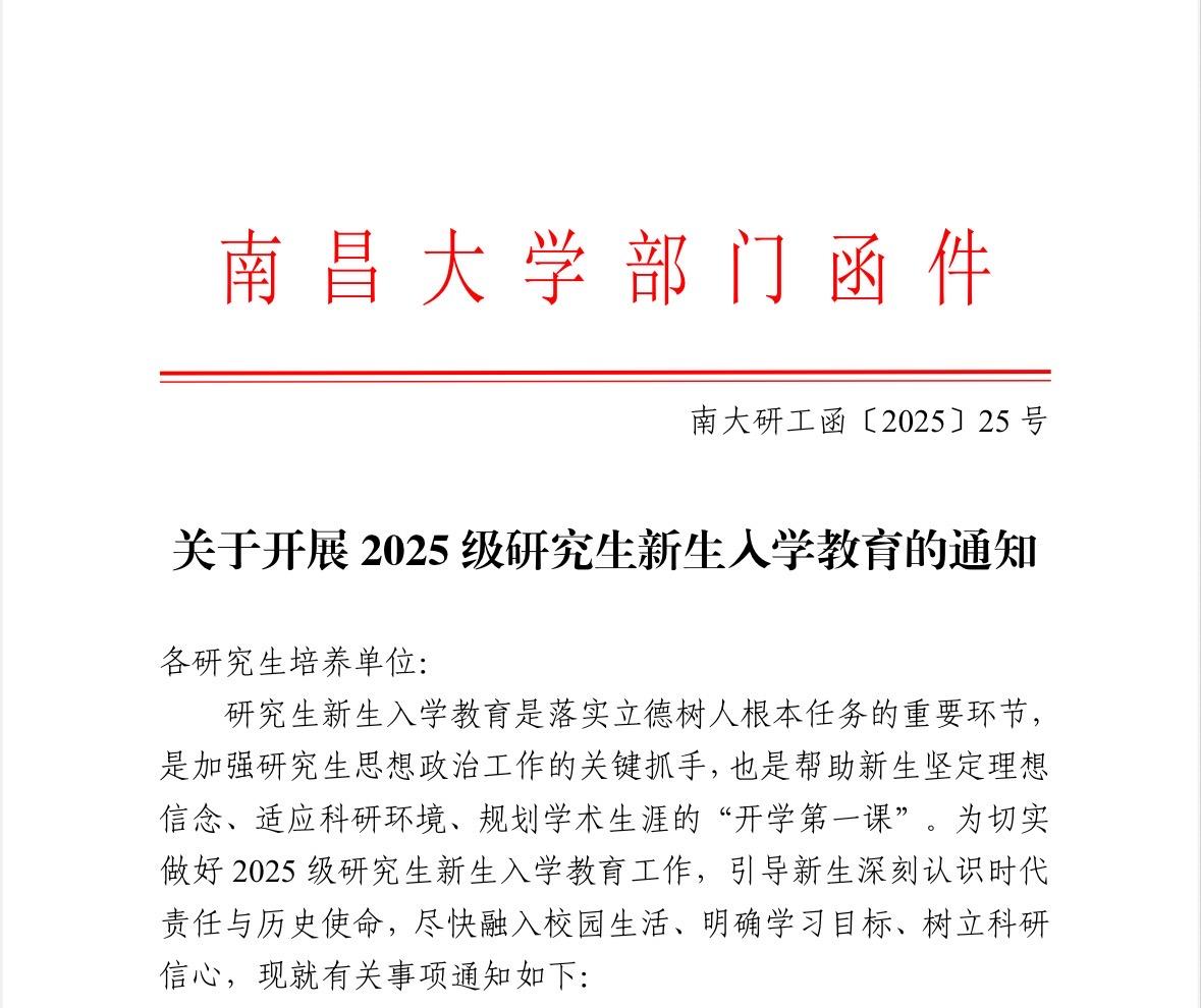 针对研究生新生,学校则量身打造了“五大方面、二十条内容”的专属入学教育方案,包括“理想信念与价值观教育”筑牢思想之魂,“校史院情与爱校荣校教育”厚植归属感,“培养、学位与日常管理教育”明确成长路径,“科学道德与学风建设教育”涵养学术品格,“安全教育”守护成长底线。通过系统化设计、模块化实施、浸润式传递,着力引导研究生新生成长为“又红又专、全面发展、可堪大任”的高层次拔尖创新人才,为学校加快建设“江西底色中国特色的世界一流大学”注入新生力量。 为扣好新生成长路上的“第一粒扣子”,学校还将于9月1日至14日开展2025级本科新生军训。通过严格的军事训练与作风养成,进一步增强学生的纪律观念、国防观念与国家安全意识,培塑爱党爱国爱军的深厚情怀,既为新生锻造强健体魄、铸就钢铁意志,更助力他们以坚毅姿态开启砥砺奋进的大学生活新篇章。