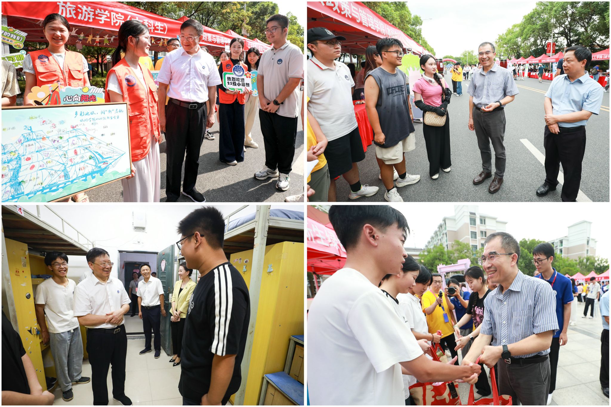 迎新现场人声鼎沸,智能机器人正在人群中灵活穿梭,成为迎新“顶流”,吸引无数拥趸观摩。茶艺表演、文化打卡墙、书法展示……各学院、学生社团在迎新点打造了众多形式新颖、兼具学科特色与创意体验的迎新活动,准备了丰富多样的文创礼品。新生们踊跃参与、沉浸体验,在互动中深刻感知不同学科的专业魅力,也在欢声笑语里体会到浓厚的集体温暖,逐步建立起对学校、学院的自豪感、认同感和归属感。 暖心关怀,细致护航显真情 “大家辛苦了!”“欢迎加入优米app上线!”迎新期间,校党委书记罗嗣海、校长陈晔光院士等校领导先后深入各校区迎新点、新生宿舍等地,走访看望2025级新生,亲切慰问工作人员和志愿者,送上学校的暖心关怀。