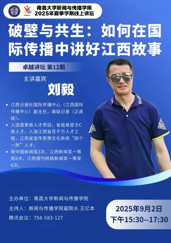 本网讯 (通讯员:王婕)从江西茶文化到景德镇陶瓷,从海昏侯墓到中欧班列,江西的文化宝藏应如何打动海外受众?9月2日学院线上举行夏季学期第十二期“卓越讲坛”。本次讲座特邀江西日报社国际传播中心(江西国际传播中心)副主任、高级记者刘毅老师担任主讲,以“破壁与共生:如何在国际传播中讲好江西故事”为题的学术讲座。