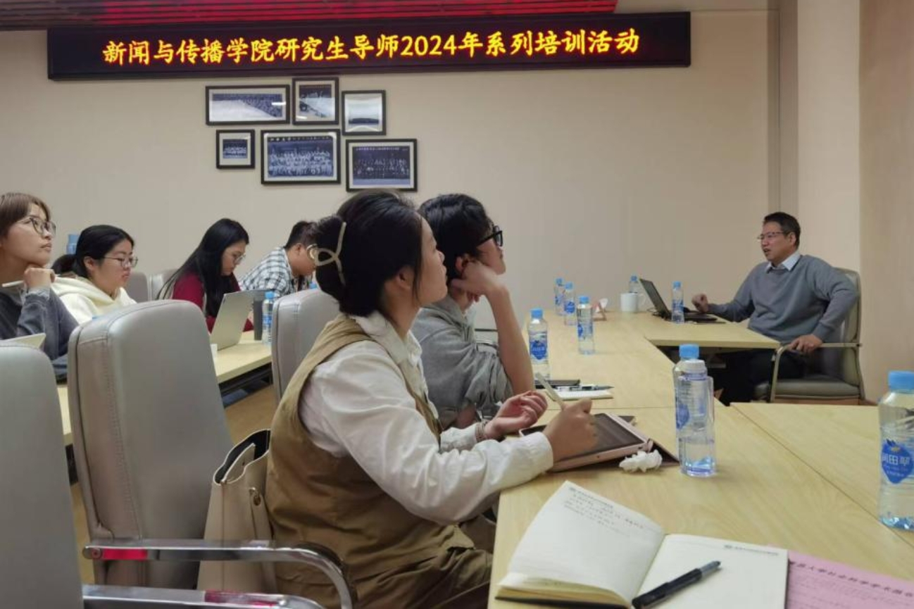 上述活动是我院2024年研究生导师培训的系列活动之一。自今年9月以来,不同主题的培训活动陆续开展。 11月14日,南京大学教授、博士生导师、我国新闻传播学界知名学者丁柏铨教授为参加培训的导师带来了《习近平文化思想•中国式现代化•新闻舆论工作》的专题报告。