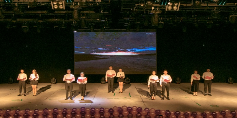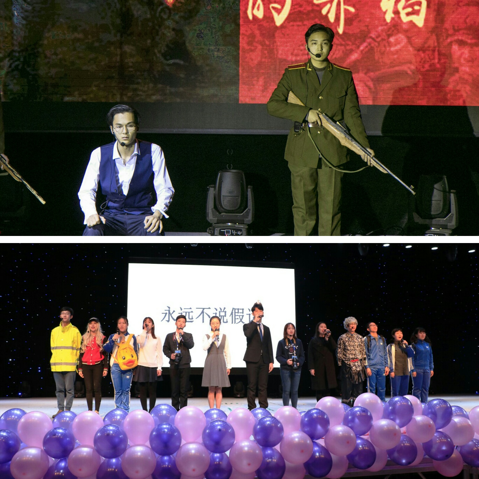 新闻专业学生准备的情景剧《新闻之眼》则是晚会的亮点之一。我们总说新闻人是铁肩担道义,妙手著文章的社会瞭望者;但其实更多时候,新闻人就是俯下身探寻事实真相的实践者;为了追求新闻报道的真实性,他们拼尽全力、不顾一切;而这,也正是新闻人的责任与担当,在利益与事实面前,新闻人永远要站在事实的一边,引导正确的舆论导向,要时刻牢记,守住自己的底线,“永远不说假话”。短剧与朗诵《永不熄灭的赤焰》则是以巧思奇妙的剧情和精湛的演技令台下观众直呼叫好。如今的电视剧多以经典历史剧翻拍,穿越剧,后宫番等为热潮,圈内人幕前幕后跨界也成常态,其中有不少成功新作吸引了大批流量,也有许多作品哗众取宠却以收视低下惨淡收场,小品《荆轲刺秦王》正是以亲临剧组的视角反讽了时下影视剧改编过程中对历史真相的肆意篡改。而配音秀《神奇一甲在哪里》更是以其独具一格的表演方式,生动有趣的剪辑视频,还有播音同学们形象传神的配音,成功吸引了全场的目光,展现了播音学子们不俗的实力与迷人的风采。 一段舒缓动听的歌曲串烧后,情景剧《武林外传》带着观众重温经典,再次回到了那个记忆深处的同福客栈,不管以后如何,我们永远不散场。