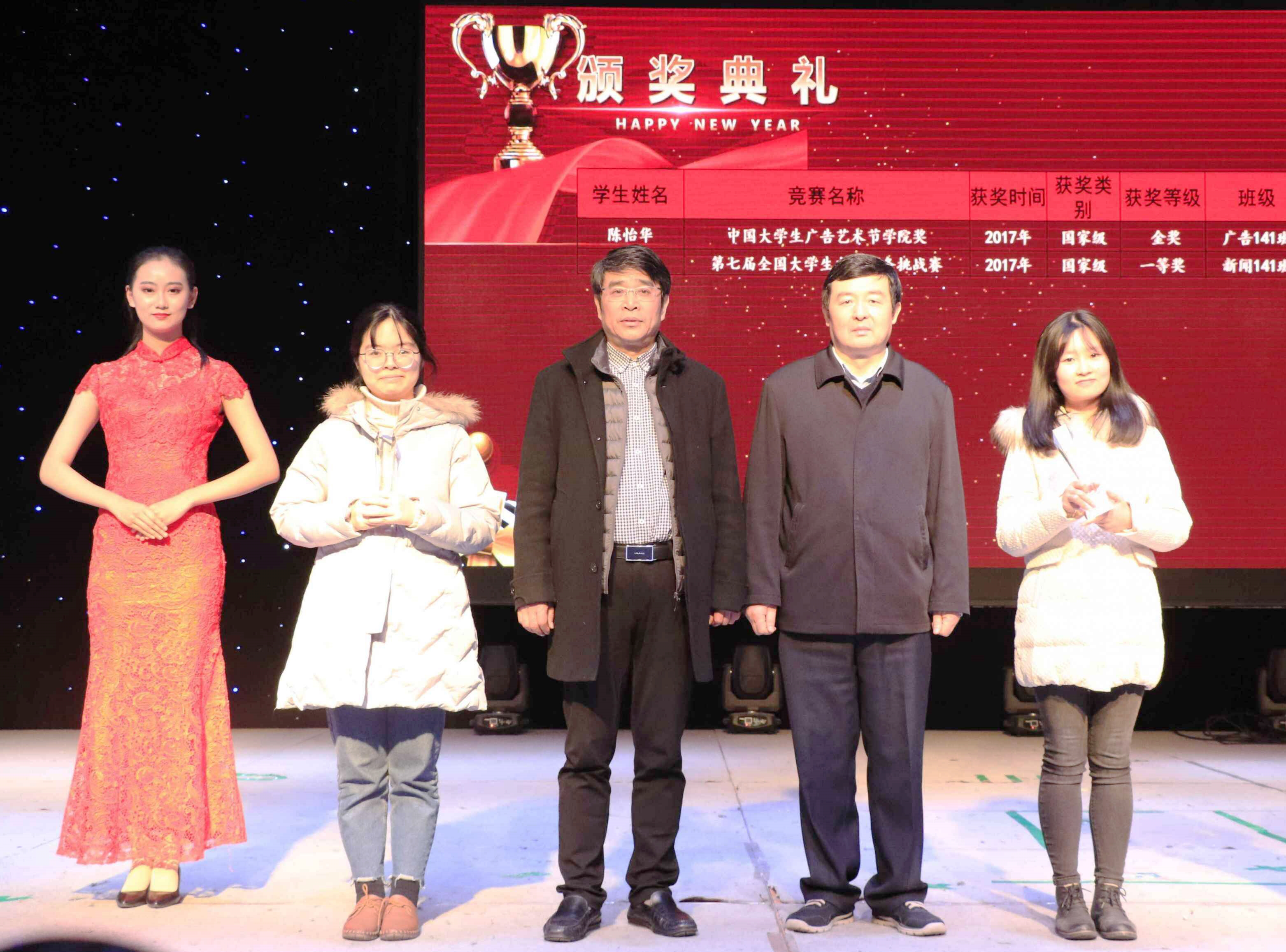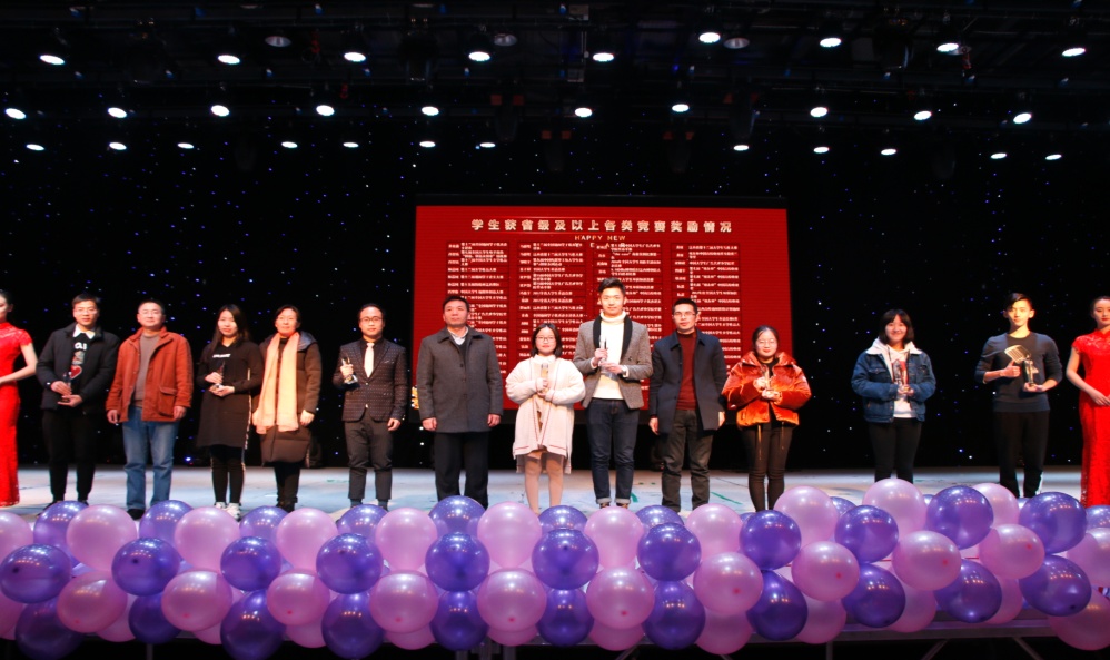 回首过去的一年,是sdaxc极其不平凡的一年。学院建设继续取得新的成就,新闻学科纳入省一流学科建设队伍,排名位列全国第25名。科研建设、学术研究我们屡创佳绩,教育教学、育德树人我们成效显著。此外,从学术科研、创新创业到各类主持竞技、新闻大赛,哪里有挑战,哪里就有新传学子拼搏的身影,哪里有荣誉,哪里就有新传学子追逐的足迹。 本次晚会穿插三轮颁奖,共为32位同学颁发了奖章奖杯。胡永新书记等校院领导为获得中国大学生广告艺术节学院奖金奖、第七届全国大学生电子商务挑战赛一等奖、第十二届全国大学生文学作品大赛、以及第四届中国大学生新媒体创意大赛等项赛事获奖的同学颁奖。