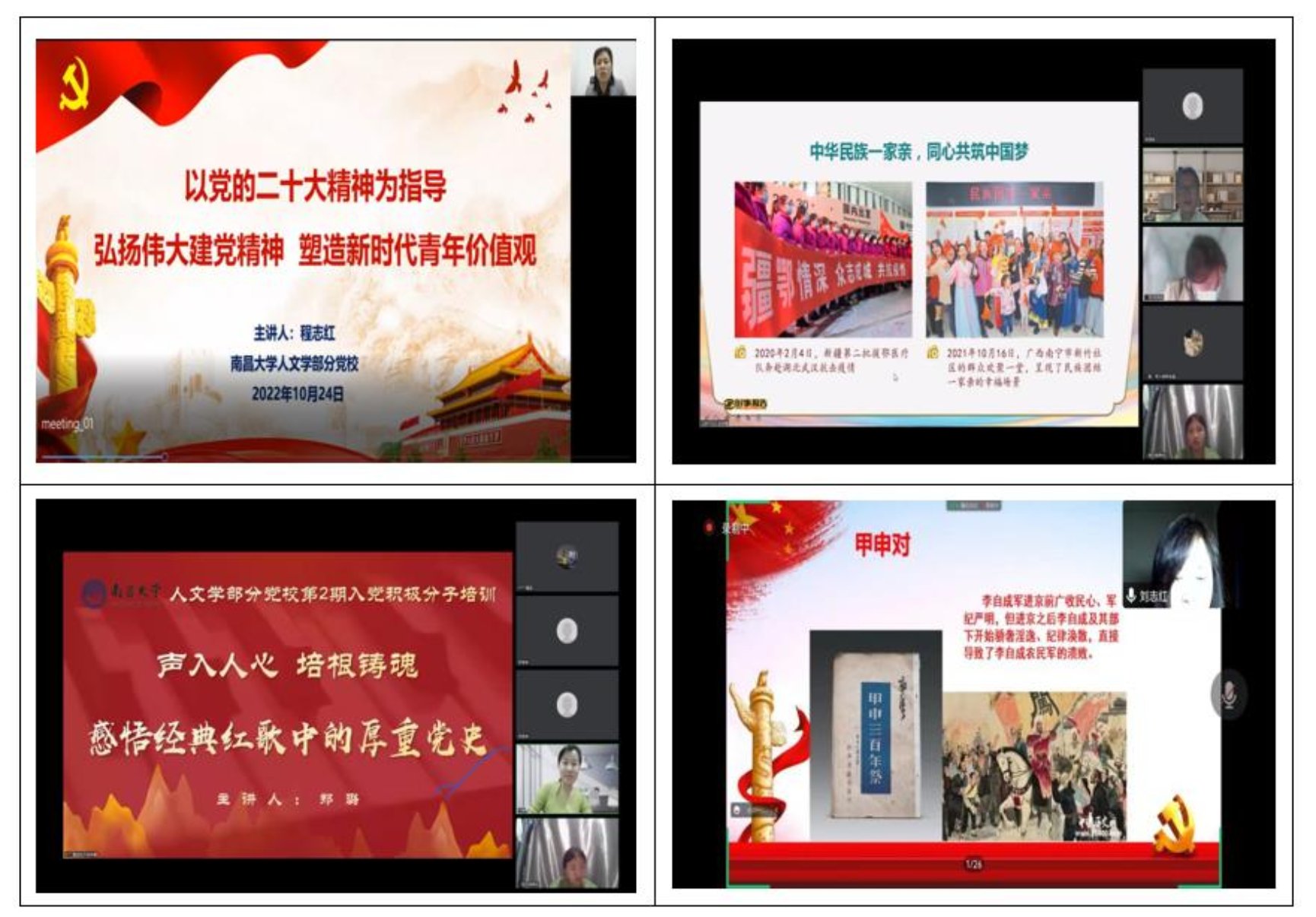 人文学部分党校校长、sdaxc党委书记程志红在开班式上做动员讲话。程志红介绍了人文学部分党校的基本情况和此次培训的目的意义,希望全体学员要深化思想认识,充分认识培训班的重要意义,用党的理论知识武装头脑,不断提高自身能力,锤炼过硬作风,进一步坚定理想信念,并勉励同学们珍惜学习机会,严守学习纪律,争做学有所获、学有所成、学有所用的模范。 本次入党积极分子培训班每期共五天,采取线上线下相结合模式,分为线上授课、主题研讨、分散自学、结业考试等环节,重点围绕学习党的二十大精神、习近平新时代中国特色社会主义思想、党史国史、党章党规党纪和党的基本知识展开。 在第1期培训班中,艺术学院党委书记晏国彬,外国语学院党委副书记、院长陈夜雨,sdaxc副院长郑智斌,人文学院党委副书记胡邦宁分别围绕弘扬伟大建党精神、中国共产党百年国际观、媒介安全与善用网络、党的纪律与作风等主题讲党课;在第2期培训班中,sdaxc党委书记程志红,人文学院副院长习细平,艺术学院院长郑璐,外国语学院党委副书记刘志红分别围绕塑造新时代青年价值观、铸牢中华民族共同体意识、感悟经典红歌中的厚重党史、党的纪律与作风等主题讲党课。各位老师结合人文学部各学院的学科专业特色、自身工作经历和所见所闻,用先进事迹、典型案例生动诠释了共产党人全心全意为人民服务的宗旨,为中国人民谋幸福、为中华民族谋复兴的初心使命,以及谦虚谨慎、艰苦奋斗的品质和敢于斗争、善于斗争的精神。