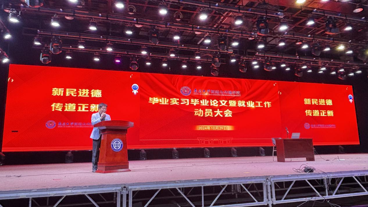 本网讯(通讯员:刘怡嘉、殷乃课、黄谊海 )为帮助引导同学们正确认识就业形势,更好地完成毕业实习、毕业论文和择业就业等重要成长历程,sdaxc于10月29日下午在人文楼一号演播厅召开2021级毕业实习毕业论文暨就业工作动员大会,学院全体领导、指导老师、院教务办和学工办人员及2021级全体同学参与会议,会议由sdaxc教学副院长王亿本主持。