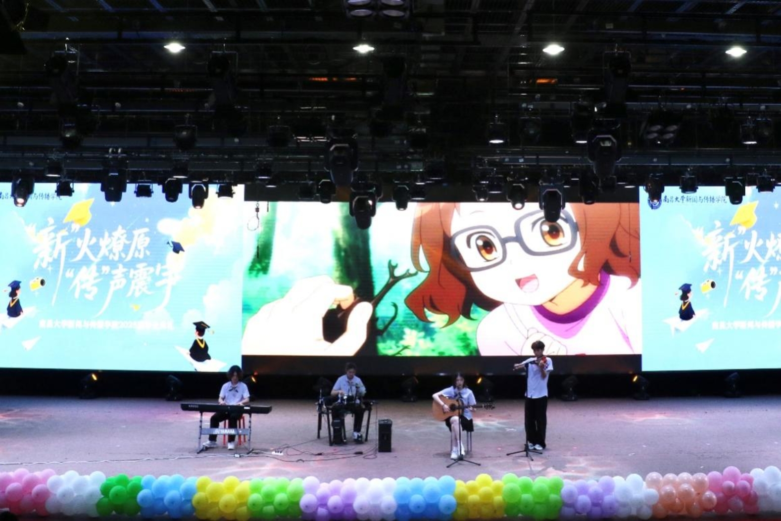 典礼前的暖场环节,大屏幕上播放毕业生们精心制作的纪念视频。一帧帧画面,记录着他们在校园里的点点滴滴。毕业生们深情演唱毕业典礼暖场歌曲,悠扬的歌声在演播厅内回荡,将现场的氛围逐渐调动起来。