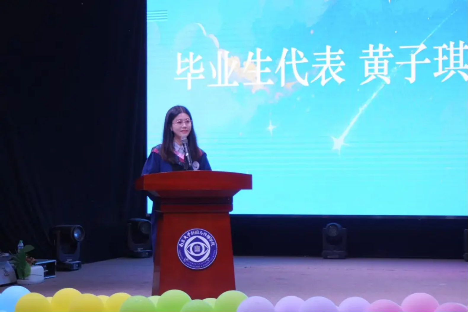学生代表2025届硕士毕业生黄子琪将她与学院的故事娓娓道来:学院始终像温暖的家滋养着我们,包容自由的成长环境让同学们能够系统地思考、讨论,自由地发挥、寻觅。这就是新传学院的魅力所在,也是学子们面对未来、走向社会的财富和底气。