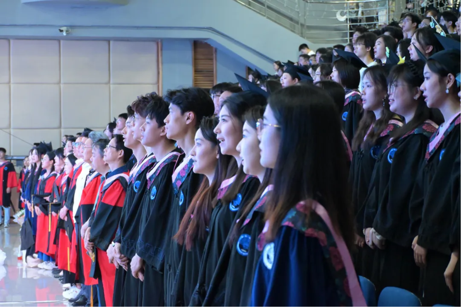 在雄壮激昂的国歌声中,毕业典礼正式拉开帷幕。全体师生肃立,目光坚定,共同唱响国歌。