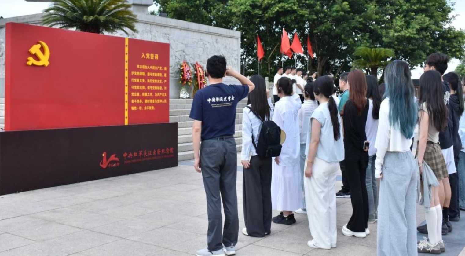 离开叶坪革命旧址后实践队员们来到沙洲坝红井旧址,在红井旁品尝甘甜的井水,饮水思源,学习“吃水不忘挖井人,时刻想念毛主席”的革命精神,坚定传承红色文化的决心。 傍晚,舒涛书记带领新传学院师生前往瑞金市融媒体中心座谈交流,共同探讨基层媒体如何利用地方优势做好本地品牌账号、媒体传播红色文化的责任担当,以及基层媒体对人才培养的建议等方面问题。座谈交流后,舒涛书记代表学院与瑞金市融媒体中心签订共建实习实践基地协议,搭建校地合作新桥梁。 于都:从长征集结出发地追寻复兴路之力量源 7月10日清晨,实践队员们前往于都县的中央红军长征集结出发地开展主题党日活动。这是一个集教育、参观、缅怀于一体的红色革命圣地。实践队先后来到红军长征纪念广场、长征渡口和中央红军长征出发地纪念馆探访。在长征出发纪念碑前,队员们驻足凝视,在舒涛书记领誓下,全体党员师生举起右拳,重温了入党誓词。