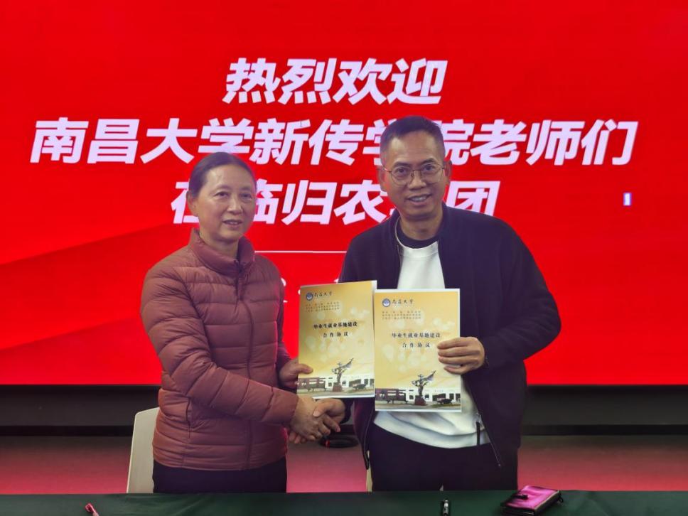 17日上午,学院一行走访校友企业归农集团,受到集团创始人蒋宪彬、肖继忠的热情接待。在参观企业数字化办公场所后,双方就新媒体营销、乡村振兴传播、复合型人才培养等展开深入探讨。座谈会上,学院领导分别介绍了学院近期的发展情况,以及介绍近三年来获得校友奖学金同学的去向情况,并对其给予学院的帮助表示感谢。蒋宪彬表示,归农集团近年来深耕社交电商与助农领域,亟需兼具传媒素养与创新能力的青年人才,未来愿与学院共建实习实训平台,助力学生职业成长。座谈会上,双方签订《共建校外实践教育基地协议书》及《毕业生就业基地建设合作协议》。