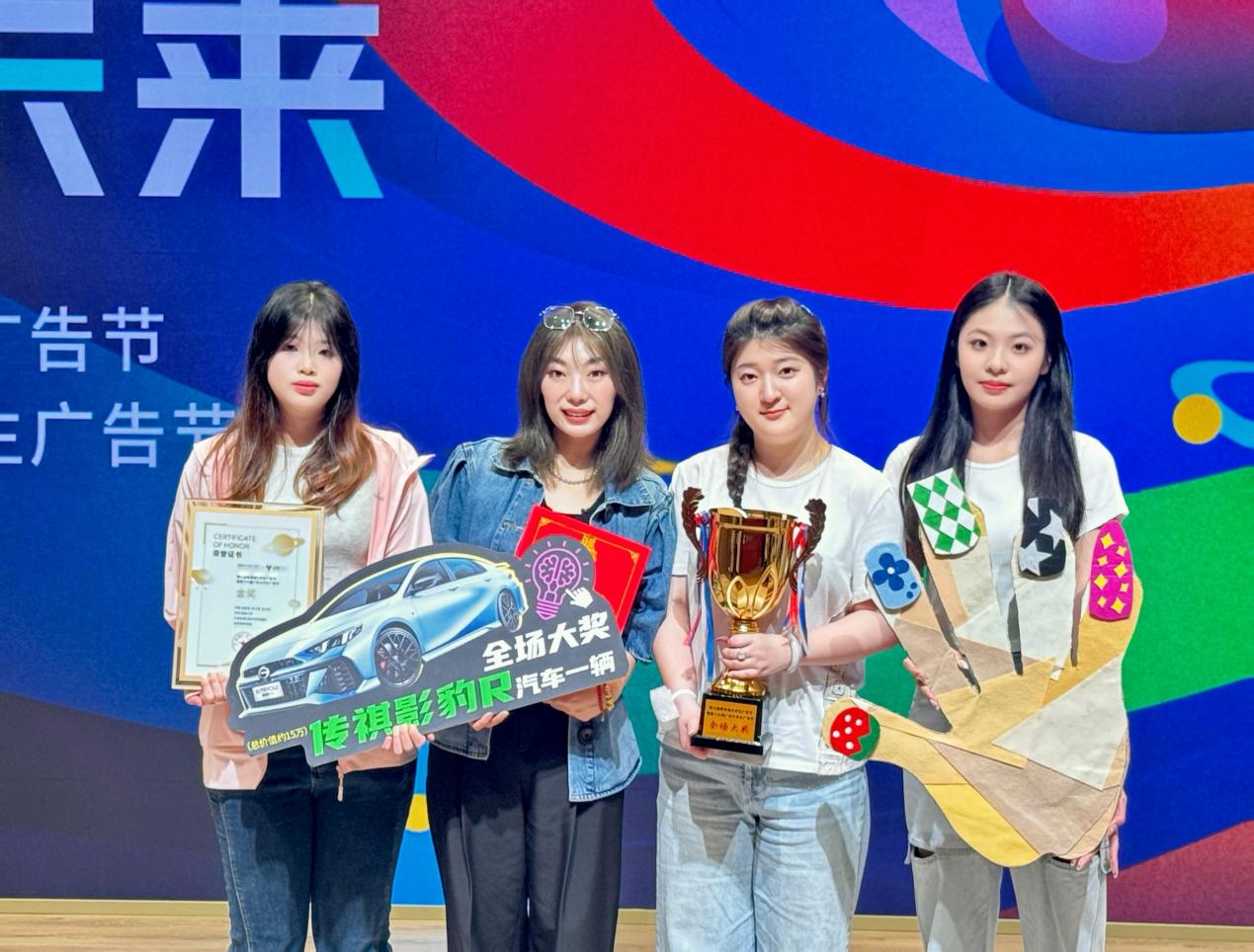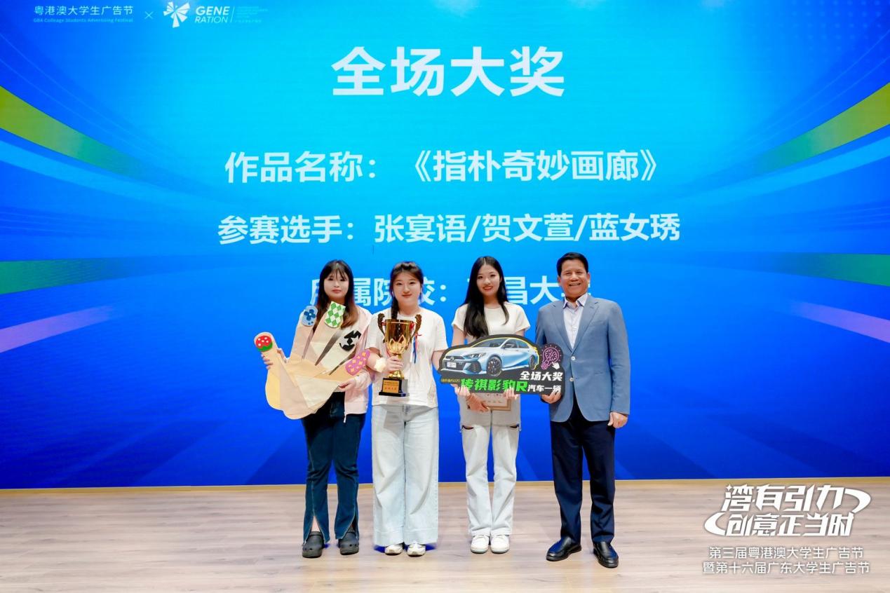 2024年3月28日下午,备受瞩目的第三届粤港澳大学生广告节暨第十六届广东大学生广告节现场PK大赛&颁奖典礼在广州市海珠区保利世贸中心隆重举行。来自各大院校的优秀获奖学生齐聚一堂,共同见证这一荣誉的时刻。我校sdaxc22级广告学专业张宴语、贺文萱、蓝女琇同学的作品《指朴奇妙画廊》,斩获本届大赛唯一全场大奖并荣获影像类作品金奖。