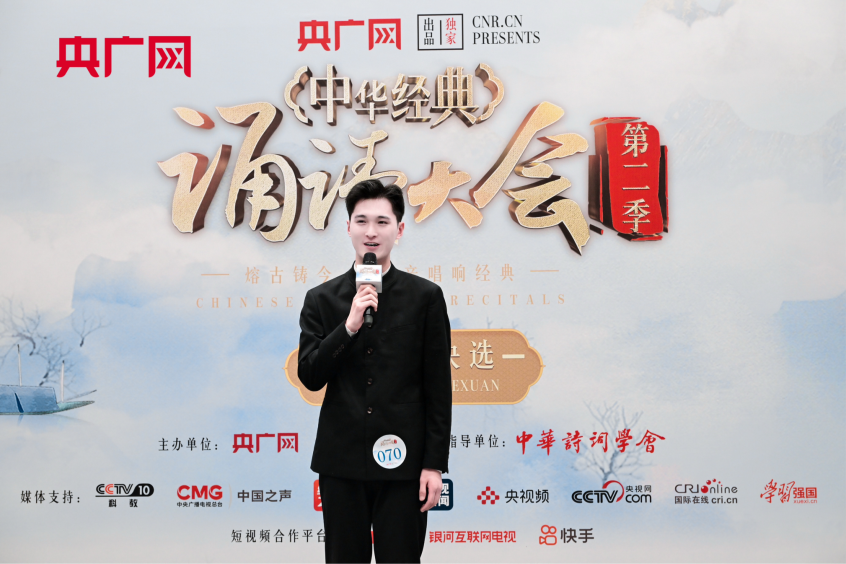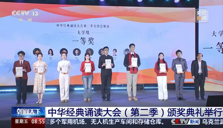 尹向东同学的参赛作品是《少年中国说》,他凭借铿锵有力、气势磅礴的音色,以及细腻的情感表达与精准的节奏把握,充分表现出这部作品的鼓舞性、激励性和感召力,斩获全国二等奖。 我院注重培养学生的专业实践能力,在播音与主持艺术专业的教学中,不仅强调专业知识的传授,还通过丰富多样的实践活动、赛事参与,为学生搭建起展示才华的平台。此次中华经典诵读大会上,两位同学取得的优异成绩正是学院教学成果的生动体现。 未来,学院将继续秉持优良的教学传统,为学生提供更多机会与资源,鼓励学生在各类赛事中展现风采,为推动中华优秀传统文化的传承与发展贡献力量。 “中华经典诵读大会”活动简介 “中华经典诵读大会”是由中央广播电视总台央广网特别策划推出的大型文化展演活动。2023年第一季活动吸引了全国各地逾10万名选手踊跃参加,在华夏大地掀起“读经典、诵国韵”热潮。活动不仅获得良好的社会反响,还被中央网信办评为“2023中国正能量网络精品”。第二季活动于2024年4月22日在全国启动,活动海选报名人数超过30万,线下海选场次突破100场,全网报道触达量超过20亿人次。 (文字:薛雯雯、尹向东 图片:薛雯雯、尹向东)