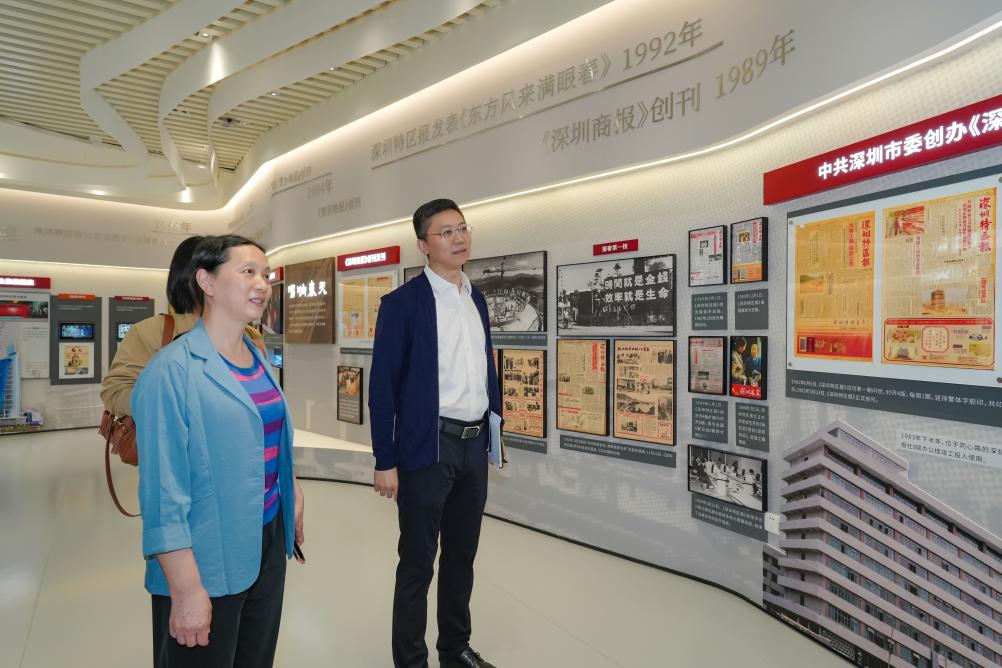 为生服务,步履不止。为进一步推进校企深度合作,促进毕业生高质量、充分就业,4月25日—27日,学院党委书记舒涛、副院长甘雨、广播电视学系主任王倩、院学工办副主任鲍昕斌一行赴深圳、广州走访校友,全面深化校企合作、供需对接,立足当前形势,为应届毕业生开拓更多就业岗位和机会。 25日下午,舒涛一行先后参观了深圳报业集团发展简史馆、学习强国深圳学习平台、视听中心、图书馆等场地、部门,深入了解报业集团在新闻传播及文化产业领域发展的历史、成就、创举和经验。