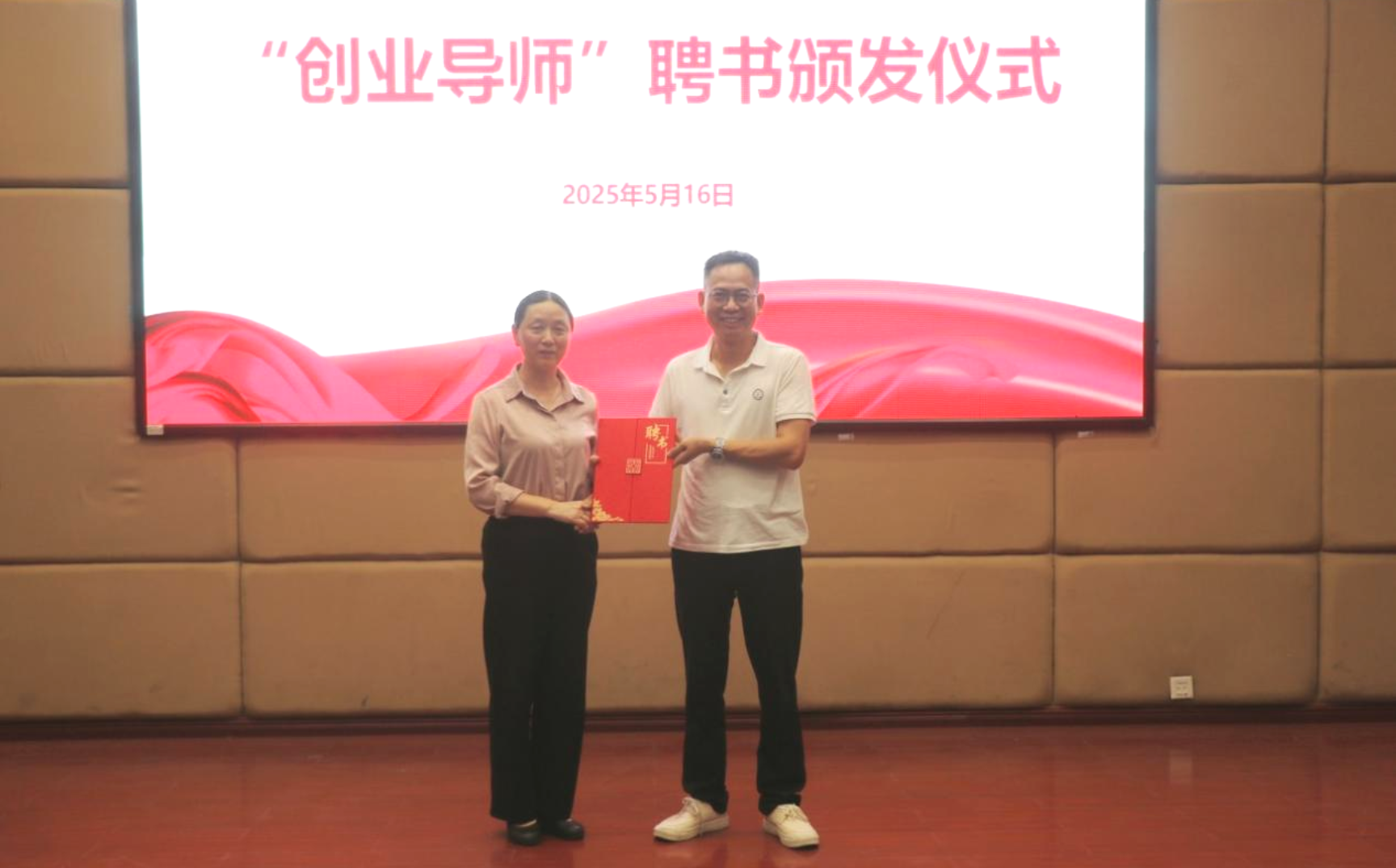 颁奖仪式后,舒涛为蒋宪彬颁发创业导师聘书,聘请其为学院学子成长的“引路人”。