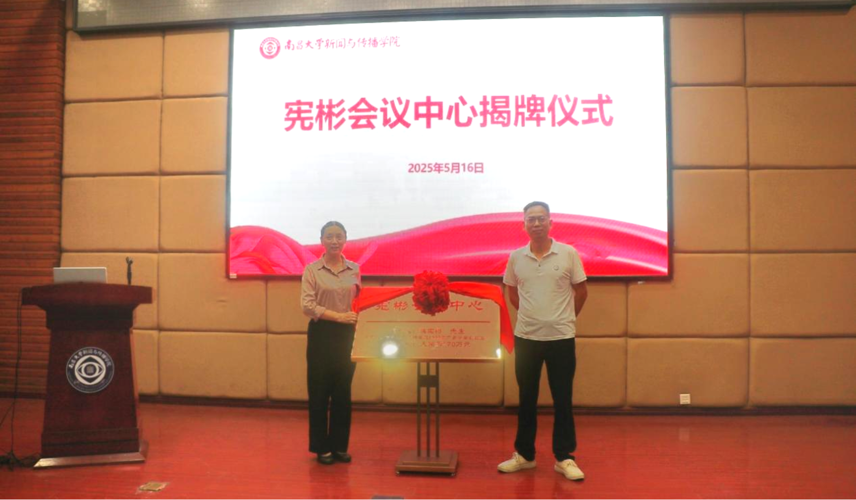 活动伊始,全场共同见证宪彬会议中心揭牌时刻。作为学院杰出校友,蒋宪彬长期心系母院发展,累计捐资超170万元支持教学科研、人才培养等事业。为表彰其桑梓情怀与公益担当,学院特以“宪彬” 命名会议中心,以此激励师生传承“饮水思源”的感恩精神。揭牌现场,舒涛与蒋宪彬共同揭开红色幕布,“宪彬会议中心”金色匾额在掌声中熠熠生辉。