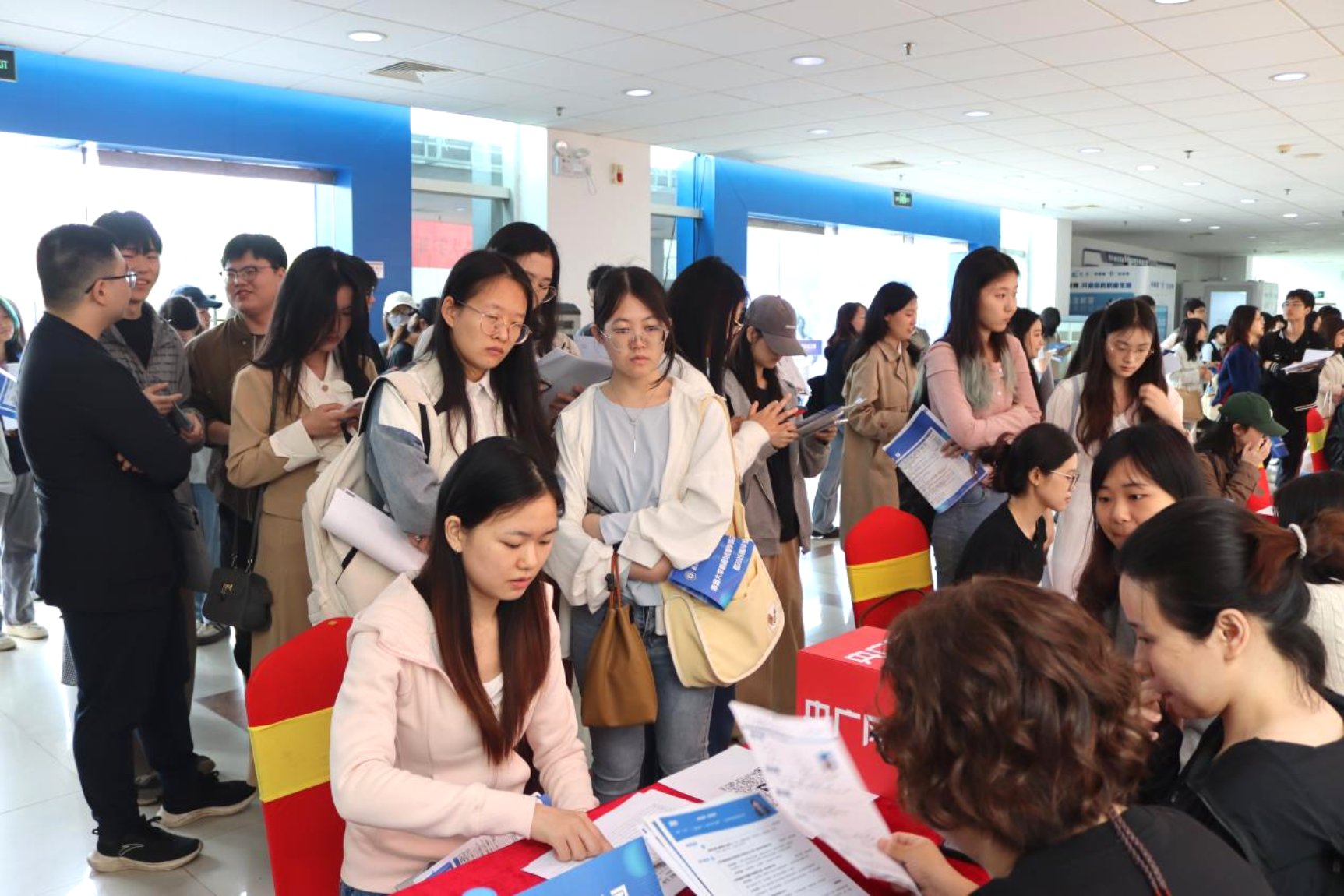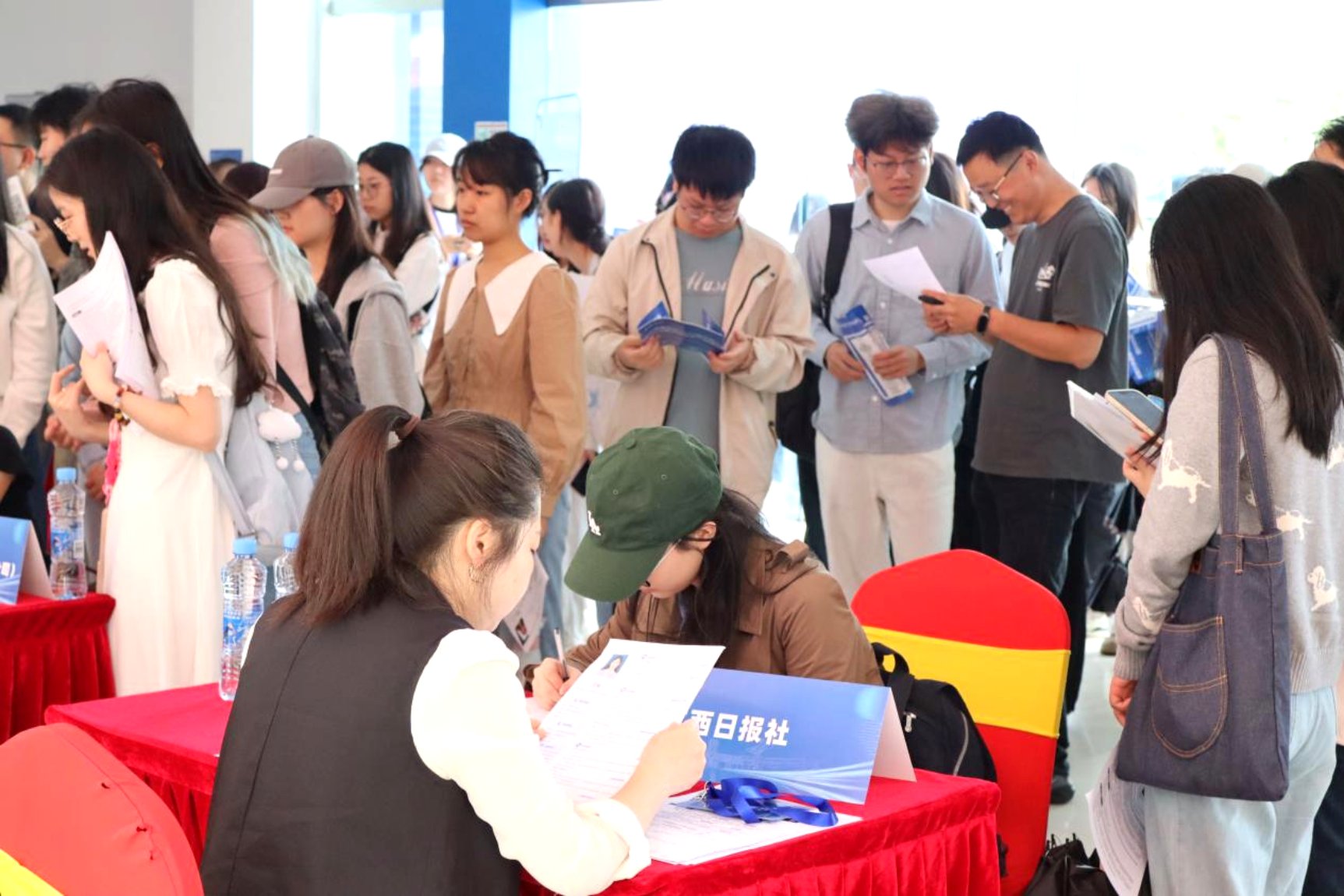 招聘会现场人头攒动、气氛热烈。学生们穿梭于各展位前,认真查看展板上的招聘信息,挑选着自己心仪的岗位。多家企事业单位展位前排满了前来投递简历和咨询的学生。据了解,本次招聘会吸引了32家知名企事业单位参与,为学生们提供了大量的就业和实习机会。参会单位涵盖了传媒、通讯、教育等多个领域,岗位种类丰富多样,充分满足不同专业学生的求职需求。