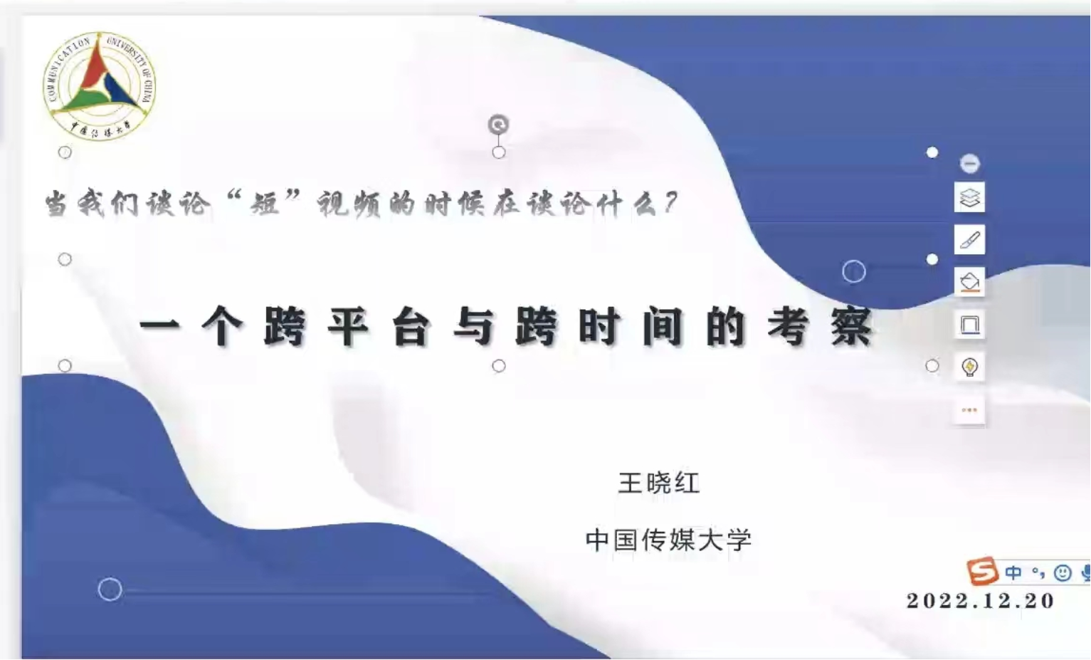 本网讯 12月20日下午,中国传媒大学本科生院院长、教授、博士生导师王晓红为我院师生带来了一场有关短视频的精彩的线上学术讲座。 本次讲座主题为“当我们谈论短视频的时候在谈论什么——一个跨平台与跨时间的考察”。王晓红教授围绕互联网短视频的过去、现在和未来,首先分析了短视频媒介与其他视听传播方式的差异和独特优势,接着剖析了短视频的兴起对社会和大众造成的深刻影响。