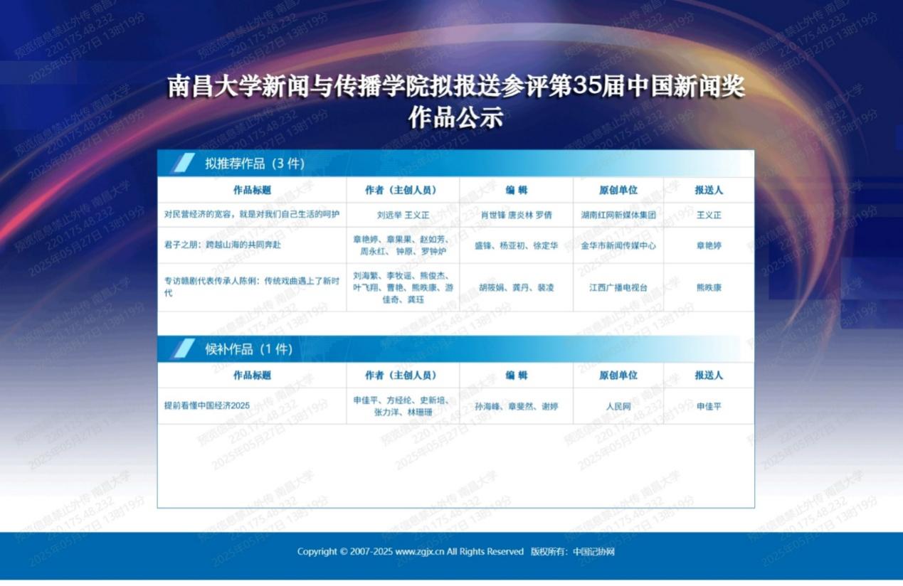 根据中华全国新闻工作者协会给各教研机构报送单位的相关通知要求,2025年5月26日,我院第35届中国新闻奖初评委员会本着公开透明、客观公正的原则,对参评作品进行了认真审核与评议,并经投票选出3件作品上报中国记协评奖办参加终评。现按照得票顺序,将初评结果公示如下: