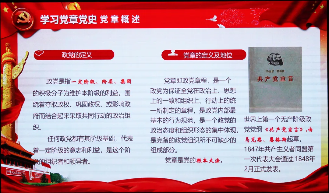 不仅如此,范书记还带领同学们学习了党章的基本内容,即党章对党的性质、宗旨、指导思想、奋斗纲领和重大方针政策做出的明确规定等等。从一大党纲、二大党章,再到十九大将习近平新时代中国特色社会主义思想写入党章,范书记带同学们回顾了那段波澜壮阔的历史。他指出,“党章的历史进程印证着政党成长发展的足迹,它的与时俱进推动了党的事业和党的建设的新发展。因此作为一名党员一定要认真学习党章,严格遵守党章。”