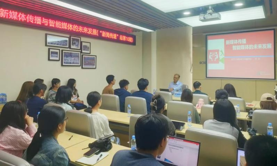 2024年10月11日下午,武汉大学新闻传播学院教授、博士生导师程明应邀到学院开展学术讲座。这是我院“新闻传道”系列学术讲座第十期,也是本学期第一讲。程教授讲座的题目是《新媒体传播与智能媒体的未来发展》。讲座由学院副院长张振亭教授主持,广告系汤晓芳主任、刘西平教授与30多名本科生、研究生参加。