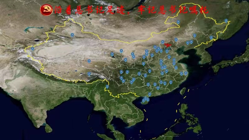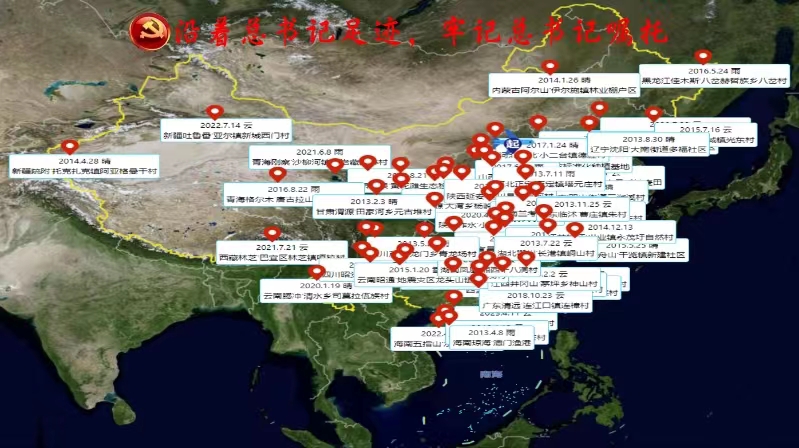 该作品是一个数据可视化的视频作品,主要基于人民网发布的《习近平系列重要讲话数据库》的新闻文本数据,以时间顺序为经、以物理地点为纬,并以图文并茂的方式生动形象地再现了习近平总书记2012年以来59次深入全国各地农村、偏远地区考察慰问的重要足迹和讲话金句,以便于直观化学习。 技术上,该作品运用共享地图、Power Point软件等实现数据可视化,既展现了新闻中的重要信息,又实现了地图轨迹动态化和可交互的阅读效果。 该作品由2023级博士生吕梁百慧在指导老师创意指导下完成创作。